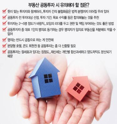 공동투자를 위해 가장 먼저 해야 할 일은 무엇보다 ‘뜻이 맞는’ 투자자를 모으는 일입니다. 공동투자가 실패로 끝나는 가장 큰 이유는 투자자끼리 발생하는 불협화음입니다. 일정 시간이 흐르면 매도를 원하는 투자자와 보유를 원하는 투자자 간에 마찰이 생겨 적절한 매도 타이밍을 놓칠 수 있습니다. 심지어는 법적 분쟁까지 발생할 소지도 있습니다. 때문에 공동투자를 하기 전 투자대상 선정, 투자기간, 목표 수익률 등을 합의해 놓는 게 좋습니다.