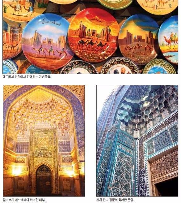 맞은 편에 있는 셰르도르 메드레세(1619~1636년)는 티무르 왕조 이후의 건축물이다. 셰르도르란 ‘사자가 있다’라는 의미다. 정문 위에 사슴을 쫓는 사자 그림이 그려져 있고 사자의 등 위쪽 태양에는 당시 영주의 얼굴이 그려져 있다. 우상숭배를 금지하는 이슬람문화권에서 동물과 사람의 얼굴을 그려 넣은 것은 파격적인 일이다. 이로 인해 무슬림의 불만을 샀다. 이를 무마하기 위해 정통 방식으로 지은 메드레세가 정면으로 보이는 틸라코리 메드레세(1646~1660년)다. 틸라코리란 ‘금박으로 된’이란 의미인데, 안으로 들어가면 입을 다물 수 없는 진풍경이 펼쳐진다. 벽면과 천정이 온통 금박으로 화려하게 장식돼 있다.