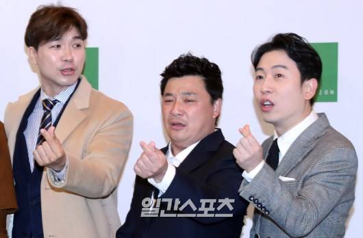 박수홍, 윤정수, 남창희가 하객 포토월에서 포즈를 취하고 있다.