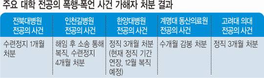 다른 사건들의 결과도 비슷하다. 2012년 후배 전공의를 때리고 반성문까지 쓰게 했던 인천길병원 전공의는 수련정지 4개월 처분을 받았다. 이후 해당 병원에서 나머지 수련을 마친 그는 전문의 자격시험을 통과한 것으로 확인됐다. 반면 피해자는 병원을 떠났고, 아예 일본으로 출국한 것으로 알려졌다. 병원 관계자는 “전공의 수련 특성상 3개월 이상 수련이 정지되면 1년에 1번인 전문의 자격시험을 칠 수 없다”며 나름 중징계였다고 해명했다.