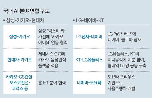 AI 생태계 확장은 엔터테인먼트와 자율주행차 등 다양한 영역으로 옮겨가고 있다. 네이버는 YG엔터테인먼트와 손자회사 YG인베스트먼트에 총 1000억 원을 투자한 후 음악사업 등에서 긴밀하게 협력하고 있다. AI 스피커 ‘누구’를 개발한 SK텔레콤은 SM엔터테인먼트와 자회사 교차 투자를 하며 협력 관계를 이어가고 있다. 네이버는 도요타의 친환경차 프리우스V를 기반으로 한 자율주행차 기술을 개발하고 있고, SK텔레콤은 BMW코리아와 5G(5세대) 네트워크 기반의 커넥티드카를 공동 개발하고 있다.