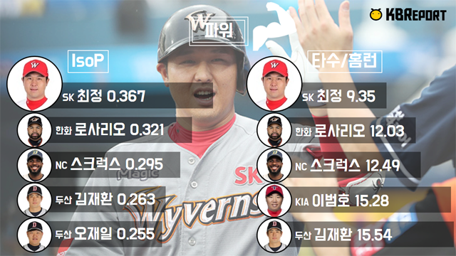 ‘소년장사’가 ‘천하장사’로 완벽하게 변신했다. 최정은 지난 시즌 40개의 홈런으로 테임즈와 공동 홈런왕에 오른데 이어 올 시즌에는 46홈런으로 단독 홈런왕에 등극했다. 데뷔 후 11년간 30홈런을 넘겨보지 못했지만, 최근 2년 연속으로 40홈런을 넘으며 리그 최고의 거포로 자리매김했다.