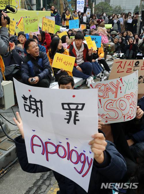 【서울=뉴시스】박진희 기자 = 22일 오후 서울 종로구 옛 일본대사관 앞에서 열린 '일본군 성노예제 문제해결을 위한 제1310차 정기 수요집회'에서 참가자들이 일본정부의 공식사죄를 촉구하는 구호를 외치고 있다. 2017.11.22.