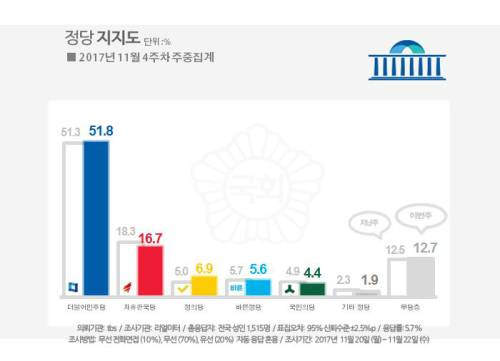 정당지지율을 보면 더불어민주당이 51.8%로 0.5%포인트 상승한 반면 자유한국당은 16.7%로 1.6%포인트 내렸다.