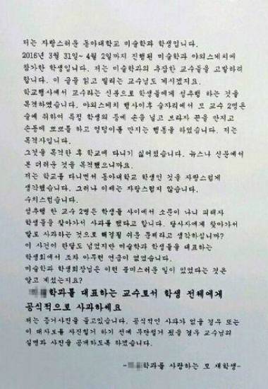 ◆ 손수호> 그렇습니다. 제자 A 씨가 대자보에 쓴 내용을 요약하면 이렇습니다. 야외 스케치 행사가 끝난 후 술자리에서 교수 두 명이 술에 취해 학생의 등에 손을 넣고 속옷의 끈을 만지고 손등에 뽀뽀를 하고 엉덩이를 만졌다. 그리고 그 증거사진을 가지고 있다.