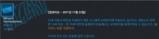 블리자드 측은 "12세 이용가 버전을 지원하기 위한 시스템이 '오버워치'에 적용돼 이제 만 12세 이상, 만 15세 미만 이용자도 플레이할 수 있다"며 "기다려 주신 모든 분들께 감사 드린다"고 전했다.