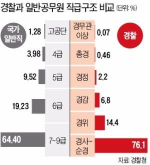 지난해 말 기준 전체 경찰 11만3077명 가운데 경위 이하 하위직 비율은 90.5%에 달한다. 경감, 경정 등 중간관리자 비율도 국가일반직 공무원(30.28%)의 3분의 1 수준인 9%에 그치고 있다. 경무관 이상 고위직은 전체 경찰의 0.07%에 불과하다. 상황이 이렇다 보니 내부적으로 ‘경포총(경무관 포기한 총경)‘ ‘총포경(총경 포기한 경정)’이라는 말까지 나돈다. 이들은 열심히 일할 유인이 없기 때문에 조직의 활력을 떨어뜨리는 요인으로 작용할 가능성도 있다.