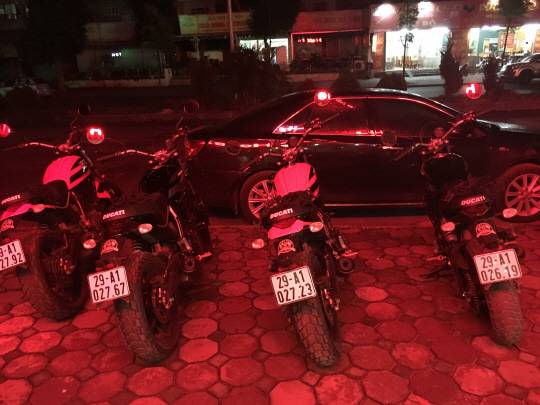 첫날 저녁 하노이에 도착, 둘째날 아침 7시에 투어를 본격 개시했습니다. 호텔 간판의 빨간 불빛 아래 준비된 두카티 스크램블러62 요,,,요,,,요녀석들!! 참 아름다웠습니다.