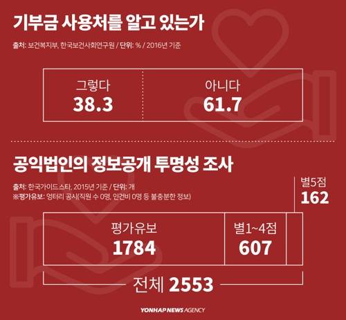 올해 초 한국가이드스타가 공익 법인의 정보공개 투명성 조사를 실시한 결과, 평가 대상 2천553개의 단체 중 엉터리로 공시한 곳이 1천784개로 절반이 넘었다. 별 5점(만점)을 받은 곳은 6%에 불과했다.