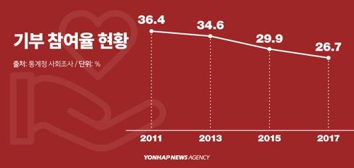 최근 통계청이 발표한 사회조사에 따르면 기부 참여율은 꾸준히 낮아지고 있다. 2011년 36.4%를 시작으로 2015년에는 29.9%까지 낮아졌다. 올해는 26.7%까지 떨어졌다. 2010년 이후 가장 낮은 참여율이다.