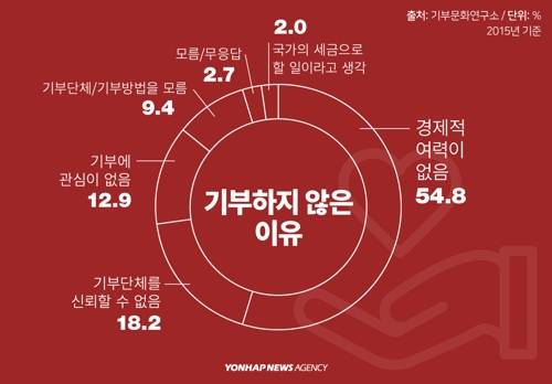 경제적인 팍팍함은 기부를 망설이게 한다. 기부문화연구소가 비기부자를 대상으로 '기부하지 않는 이유'를 설문 조사한 결과 절반 이상이 "경제적 여력이 없어서"(54.8%)라고 답했다.