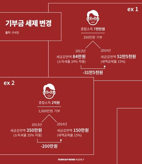 "2014년 세법 개정으로 기부금 연말 정산 공제 방식이 소득공제에서 세액 공제로 전환되자 세 부담 증가 등의 이유로 국세청에 신고된 기부금이 처음으로 감소하기 시작했다"
