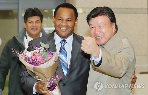 홍수환 한국권투위원회 회장의 '4전 5기 신화' 상대였던 '지옥에서 온 악마' 엑토르 카라스키야가 26일 오후 인천공항을 통해 입국, 홍 회장과 포즈를 취하고 있다.