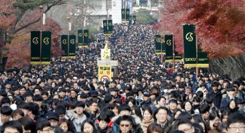 | 끝이 안보이는 수험생 행렬 26일 서울 종로구 명륜동 성균관대학교에서 2018학년도 대입 수시모집 논술고사를 마친 수험생들이 정문을 나서고 있다. 910명을 모집하는 성균관대 수시 논술전형에는 5만1314명이 지원해 56.4대 1의 경쟁률을 기록했다. 하상윤 기자 |