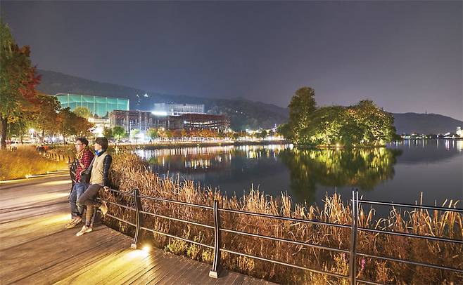 수변 데크길 위로 가족, 연인, 친구들이 줄지어 걸어간다. 2km 정도의 산책길이라 40분 정도면 한 바퀴를 돈다. 단풍은 노란 가로등 불빛에 더 노랗고, 갈대는 질투라도 하듯이 고개를 주억거린다. 대구 시민들이 가장 사랑하는 호반 유원지, 수성못이다.
