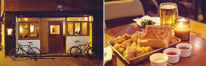 서울의 연남동, 경리단길이 그랬다. 평범한 주택가에 조그만 카페와 맥주 집이 들어서기 시작했다. 대구의 삼덕동도 마찬가지다. 최근 몇년 새 작지만 감각 있는 공간들이 속속 생겨났다. ‘사람들은즐겁다’에는 간판조차 없다. 때가 되면 불이 들어올 뿐이다. 동성로에 1호점이 있지만, 삼덕동에 위치한 2호점의 매력이라면 한적하고 고즈넉한 분위기다. ‘편안하고 조용한 공간이고 싶습니다.’ 메뉴판 첫 장에 적힌 문구가 정확하다. 대표메뉴의 이름은 정직하다. ‘닭튀김과 토스트, 감자튀김’. 네모난 트레이에 사이좋게 올린 바삭한 닭튀김과 달콤 짭조름한 치즈 토스트, 수북한 감자튀김은 절대 맛없을 리 없는 맥주 안주다.