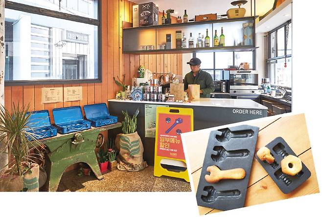 너트, 볼드, 스패너는 함께 있어야 완전해진다. 북성로공구빵(Factory09)의 공구 모양 마들렌도 마찬가지다. 세 개를 한꺼번에 주문해야 뭔가 그림이 완성된다. 아니 하나가 더 있어야 한다. 촉매 역할을 하는 아메리카노 커피다. 투박한 공구를 마들렌으로 재탄생시킨 아이디어는 대구콘텐츠코리아랩의 브랜딩 프로젝트 공모전에서 3위를 한 최현석씨의 것이다. 그것을 현실화시킨 빵틀 주물 제작은 북성로에 유일하게 남은 주물업체인 선일포금과의 콜라보로 가능했다. 아이디어로 창업을 하게 된 최현석씨는 공예 작업을 하던 예술가 출신이라 가게 내부가 작지만 아기자기하다. 다만, 공구골목이 아니라 수제화골목에 위치하고 있으니 유의할 것.