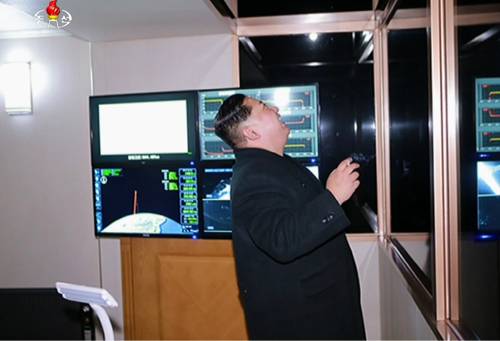 | 북한 조선중앙TV가 30일 방영한 대륙간탄도미사일(ICBM)급 `화성-15`형의 전날 발사 영상에서 김정은이 모니터를 배경으로 발사를 지켜보고 있다. |