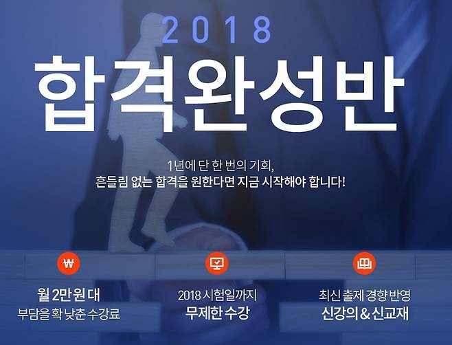 2018 물류관리사 합격완성반은 월 2만원 대로 수강료 부담이 적다. 시험일 까지 무제한 수강이 가능하다. 최신 출제경향을 반영한 신강의와 신교제가 있는 것도 특징이다.