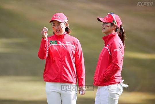 김해림(롯데)과 김지현(한화)이 1번홀 그린 공략을 상의하며 밝게 웃고 있다. (사진=KLPGA 제공)/smfoto@maniareport.com