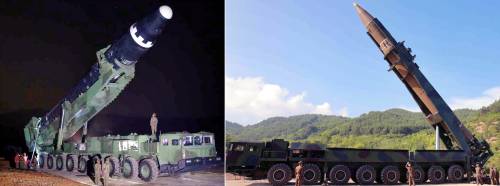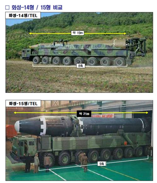 | 북한이 지난 29일 발사한 대륙간탄도미사일(ICBM) 화성-15(왼쪽)와 7월 발사한 ICBM 화성-14형(오른쪽). 연합뉴스 |