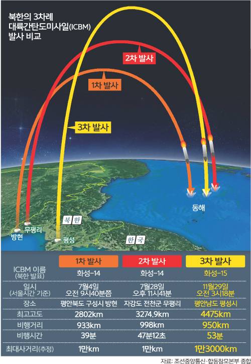 지난달 29일 새벽 북한이 발사한 대륙간탄도미사일(ICBM) 화성-15는 김정은의 ‘국가 핵무력 완성’ 선언에 상응하는 능력을 보여줬다.