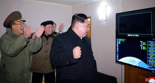 | 김정은 북한 노동당 위원장이 미사일 발사 지시를 친필명령한 대륙간탄도미사일(ICBM) 화성-15 시험발사를 참관하며 환호하는 김정은 북한 노동당 위원장. 연합뉴스 |