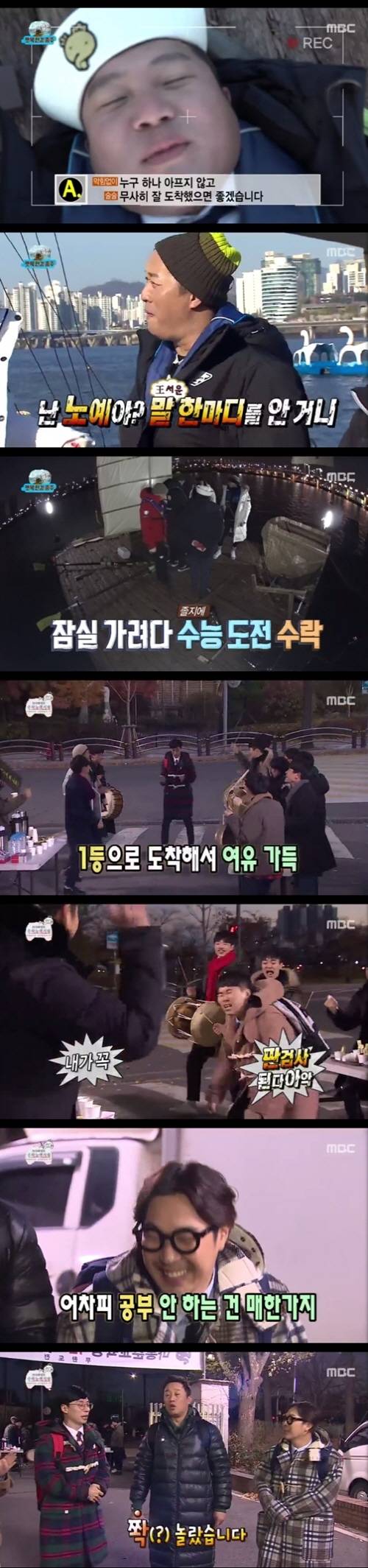 체력과 바람 등 모든 상황이 최악인 가운데 김태호 PD는 멤버 6명이 수능 문제 50% 이상 맞으면 도전에 성공한 걸로 해주겠다고 했다.