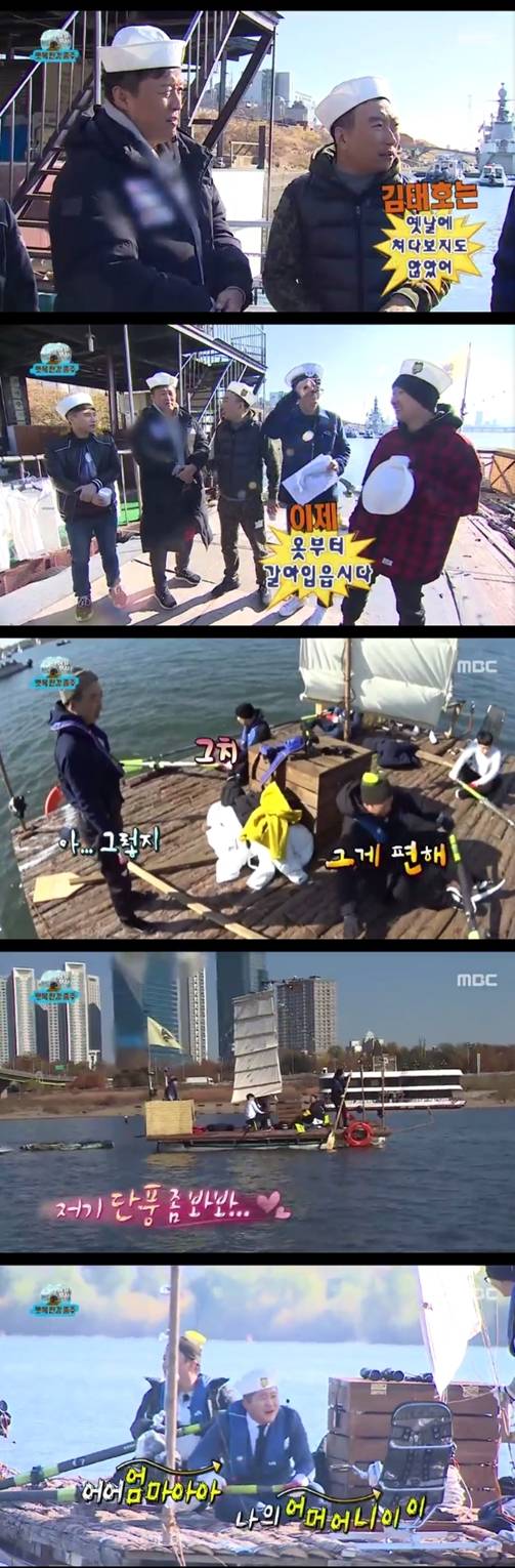멤버들은 아무것도 모른 채 촬영 장소에 도착했다. 첫 영하의 날씨에 무동력 뗏목을 타게 된 멤버들은 "추운데 무슨 뗏목이냐"며 불평을 계속했다. 하지만 어쩔 수 없이 따라야 했다. 뗏목은 고정노 4개에 페달 2개를 장착, 지난 도전 때보다 업그레이드 됐다.