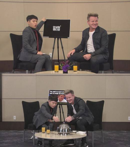 세계적인 스타 셰프의 대세 모바일 프로그램 출연인 만큼, 두 사람의 인터뷰는 지난달 철저한 보안 속에 진행됐다. 헬스 키친, 키친 나이트 메어 등의 프로그램을 진행하며 참가자들의 음식이 마음에 들지 않으면 주방에서 쫓아내거나 거침없는 폭언을 일삼으며 세계적인 인기를 끌고 있는 고든램지가 MC 양세형에게는 ‘머리 스타일이 참 멋지다’고 인사하며 화기애애한 촬영을 시작했다.