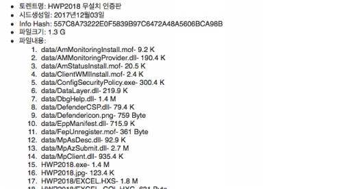| 한글2018으로 가장한 악성파일 목록. /사진=토렌트 사이트 캡처 |