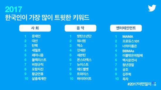 트위터 코리아가 5일 공식 SNS계정을 통해 ‘2017 한국인이 가장 많이 트윗한 키워드’를 발표했다. 사회, 음악, 엔터테인먼트 세 부분으로 나뉘어 10위까지 순위를 매겼다.