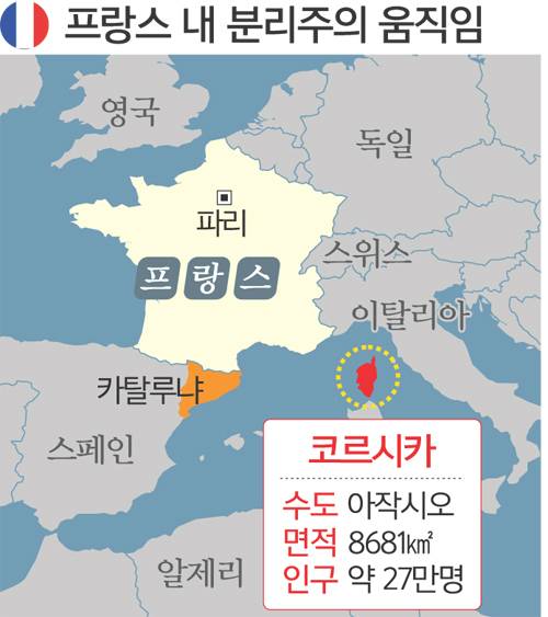 스페인 카탈루냐가 분리독립을 추진하다 중앙정부의 강력한 반대에 부딪혀 고전하는 가운데 프랑스에서도 분리주의 움직임이 거세지고 있다. 프랑스로서는 민족주의 열망과 분리독립 움직임에 잘못 대처할 경우 사태가 다른 해외 영토나 다른 나라에 영향을 줄 수 있어 정치적 부담이 적지 않다.