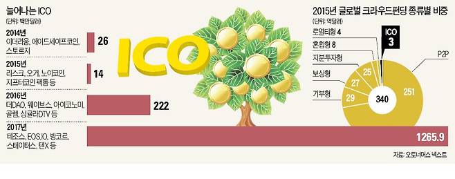 ‘가상화폐 ICO 열풍’이 불고 있다. ICO는 초기코인판매(initial coin offering)의 약자로, 블록체인 기반 프로젝트를 위한 펀딩 방법이다. 자금을 필요로 하는 수요자가 온라인 플랫폼 등을 활용해 불특정 다수를 대상으로 자금을 모으는 방식인 크라우드 펀딩을 생각하면 이해하기 쉽다. 크라우드 펀딩에는 상품을 선(先)판매하는 방식이 있다. 예를 들어 5000원짜리 커피 100잔을 100명에게 선판매하면 한 번에 5000만원의 투자금을 모을 수 있다. ICO는 커피 대신 코인(가상화폐)을 선판매하는 것이라고 보면 된다. ICO가 다른 점은 크라우드 펀딩의 커피는 커피일 뿐이지만 가상화폐는 복잡한 비즈니스 모델과 함께 고도의 기능을 약속하고 발행한다는 점이다.
