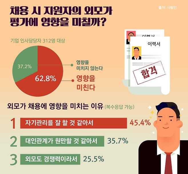 구직자들이 이렇게 느끼는 데는 그만한 이유가 있습니다. 채용 과정에서 외모와 관련된 질문을 받는 사례가 있는 데다, 채용 시즌만 되면 인사담당자들이 외모를 중시한다는 이야기가 나오기 때문입니다. 실제로 지난해 한 통계에서는 기업 인사담당자 10명 중 6명이 채용 평가 시 지원자의 외모에 영향을 받는 것으로 조사됐습니다.
