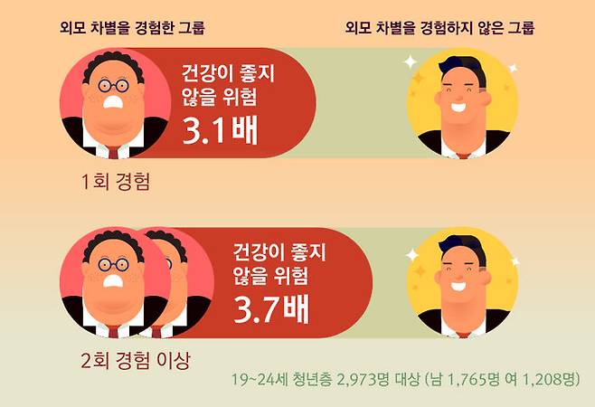 대상자의 7.6%가 조사 당시 건강상태가 좋지 않다고 답했는데, 외모에 대한 차별을 1회 경험한 그룹은 이런 차별을 경험하지 않은 그룹보다 건강이 좋지 않을 위험이 3.1배에 달했습니다. 특히 차별을 2회 이상 반복해서 경험한 그룹은 건강 위험도가 3.7배였습니다. 외모 차별 경험이 스스로 느끼는 건강상태에도 안 좋은 영향을 미친 겁니다.