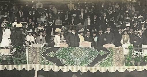 | 1908년 런던 올림픽 주경기장에 있던 귀빈석. 사진 가운데 왼쪽에서 여덟 번째 서 있는 남자가 당시 영국 왕 에드워드 7세. 그 증손녀가 현재 엘리자베스 2세 여왕. |