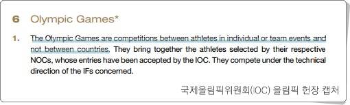 많은 사람이 흔히 착각하는 것과 달리 올림픽 경기는 개인 또는 팀 간 경쟁이지 국가 간 경쟁이 아닙니다(The Olympic Games are competitions between athletes in individual or team events and not between countries). IOC 올림픽 헌장 6조 1항에 분명히 그렇게 나와 있습니다(아래 사진 참조).