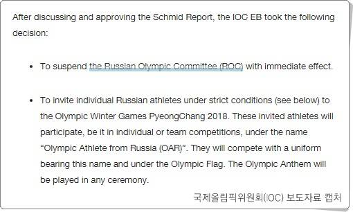 6일 스위스 로잔에서 열린 국제올림픽위원회(IOC) 집행위원회에서 2018 평창 겨울 올림픽 참가 금지라는 징계를 내린 대상은 러시아올림픽위원회(ROC)이지 러시아 선수단이 아닙니다. IOC에서 이날 발표한 보도자료(아래 사진)를 보시면 확실히 그렇다는 걸 알 수 있습니다.