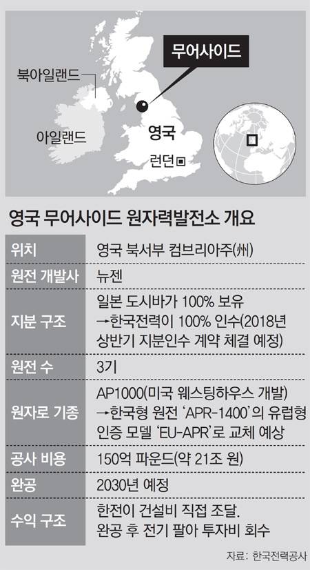 영국 북서부에 원전 3기를 건설하는 무어사이드 프로젝트는 사업권을 컨소시엄 회사인 ‘뉴젠’이 보유하고 있다. 일본 도시바가 지분 100%를 갖고 있으나 자금 사정 악화로 사업권 매각을 시도했다. 한전은 올해 3월 인수 참여를 선언했다.