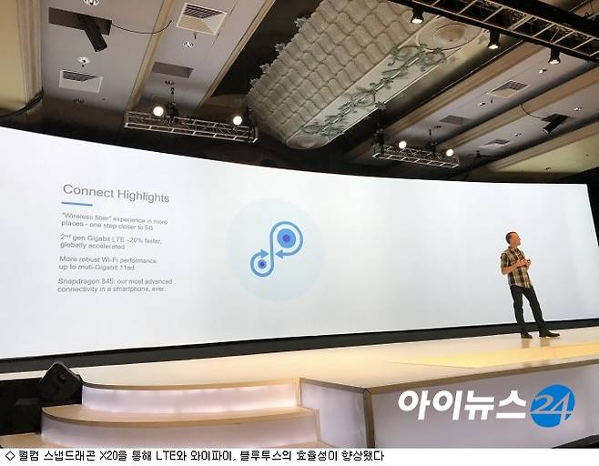 [아이뉴스24 김문기기자] 퀄컴 스냅드래곤845의 LTE 및 와이파이 블루투스 속도가 기존 대비 향상됐다. 차세대 통신모뎀인 스냅드래곤X20이 장착됐다.