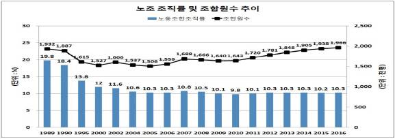 지난해 기준으로 우리나라 노동조합 조직률은 전년보다 0.1% 포인트 증가한 10.3%로 나타났다.