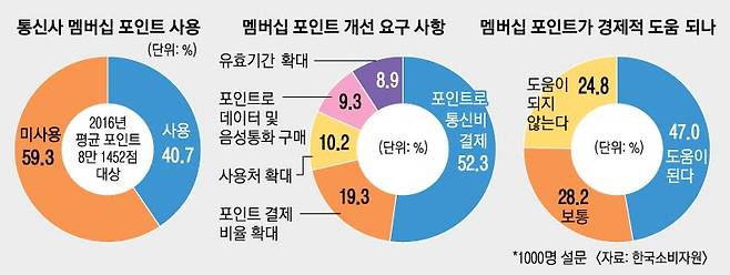 소비자원이 지난해 실태 조사를 한 결과 통신 가입자 1인당 평균 8만 1452점을 받아 59.3%(4만 8297점)는 사용하지 못하고 소멸되는 것으로 나타났다. 그러나 통신사들은 항공, 신용카드 등 마일리지와 달리 맴버십 포인트는 ‘제휴 할인’이어서 통신비 할인 등으로 돌릴 수 없다는 입장이다.