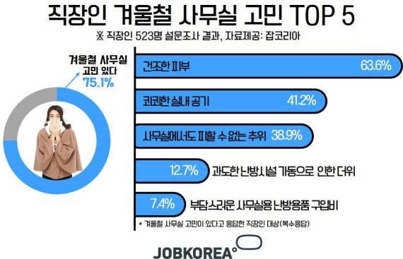 직장인의 75.1%는 겨울철 사무실 고민을 갖고 있다고 밝혔다. 직장인은 겨울철 사무실의 가장 큰 고민으로(복수응답) △건조한 사무실 탓에 건조해지는 피부(63.6%)를 꼽았다. △환기가 안돼 쾨쾨한 실내 공기(41.2%) △사무실에서도 피할 수 없는 추위(38.9%) 등도 직장인들이 겪고 있는 겨울철 사무실 고민인 것으로 조사됐다.