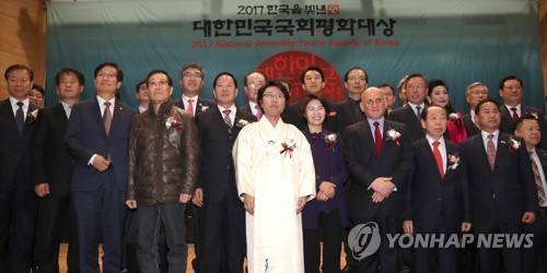 (서울=연합뉴스) 백승렬 기자 = 8일 국회 의원회관에서 열린 2017 한국을 빛낸 대한민국 국회평화대상 시상식에서 세계평화사랑연맹 이사장인 한한국 평화작가와 수상자들이 기념촬영을 하고 있다. 수상자로는 반기문 전 유엔사무총장, 박주선 국회부의장, 조국강 중국안전산업협회 상무이사장, 자유한국당 이주영·더불어민주당 한정애·신동근 의원, 와디 알 바티 주한 이라크 대사 등이 선정됐다. 행사관계자는 반 전 유엔 사무총장은 개인 일정으로 행사에 참석하지 못했다고 밝혔다. 2017.12.8