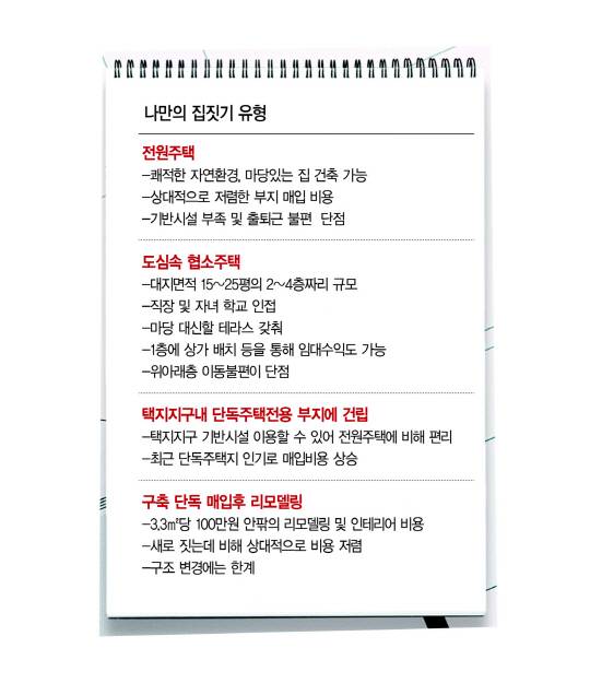 이는 무엇보다 원하는 대로 집을 지을 수 있다는 장점이 있다. 어느 집이나 거의 똑같은 구조인 획일적인 아파트와 달리 가족들의 라이프스타일에 맞춰 집을 지을 수 있다. 기성품이 아닌 맞춤옷이 내 몸에 더 잘 맞는 것과 같은 이치다. 단독주택의 평면은 단순히 24평이냐 33평이냐, 방 몇 개에 화장실 몇 개로 대표되는 아파트의 평면과 다르다.