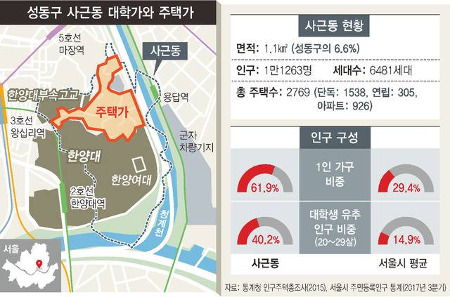 ■ 사근동 인구 구조도 바뀌어 사근동의 노후한 하숙·주택을 중심으로 원룸 리모델링 열풍이 불기 시작하면서, 사근동의 가구 구성도 대학생 중심의 1인 가구 위주로 재편됐다. 2015년 통계청의 인구주택총조사를 보면, 사근동의 1인 가구는 전체 가구 가운데 61.9%(4322가구)로 서울시 1인 가구 평균인 29.4%의 두 배가 넘는다. 대학생으로 유추할 수 있는 20~29살 인구 역시 사근동 전체 인구 가운데 40.2%에 달한다. 서울시 평균(14.9%)보다 두 배 이상 높다.