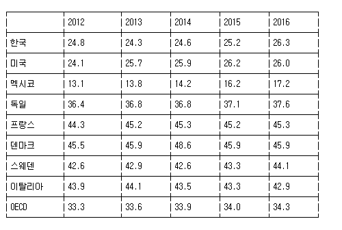 우리나라는 OECD 평균(34.3%)에 비해서도 8%포인트 낮은 수준이다.