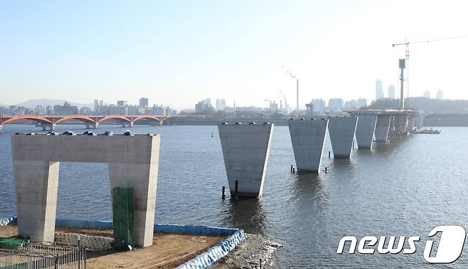 (서울=뉴스1) 신웅수 기자 = 12일 오후 서울 월드컵대교 건설현장에서 교각 연결 작업이 진행되고 있다.
