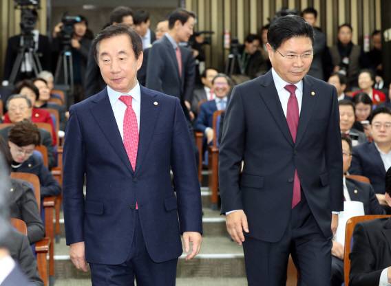 김 원내대표는 외연확장에도 힘쓰겠다고 말했다. 취약계층은 물론 바른정당에도 문을 개방해 ‘중도 보수’를 통합하겠다는 것이다. 그는 “한국당은 이제 가진 자나 대기업 정당이 아니라 친서민·노동자 정당으로 외연을 넓혀야 한다”며 “기울어진 운동장을 되돌리기 위해선 보수대통합이 필연적이다. 언제까지 집 떠난 바른정당을 미워할 수 없다”고 부연했다.